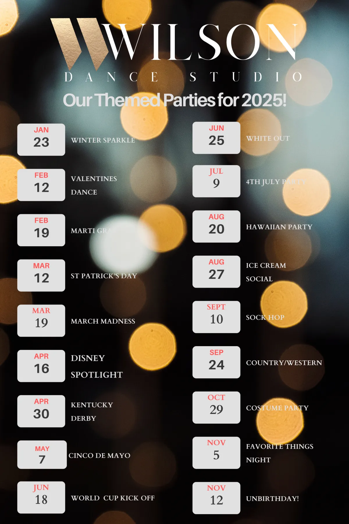 Once a month for our Thursday party @ 8pm, we add a sprinkle of themed magic, transforming our studio into a unique dance haven. From the spirit of college football in September to the glitz and glam of December, our monthly themed parties are a highlight you won't want to miss.